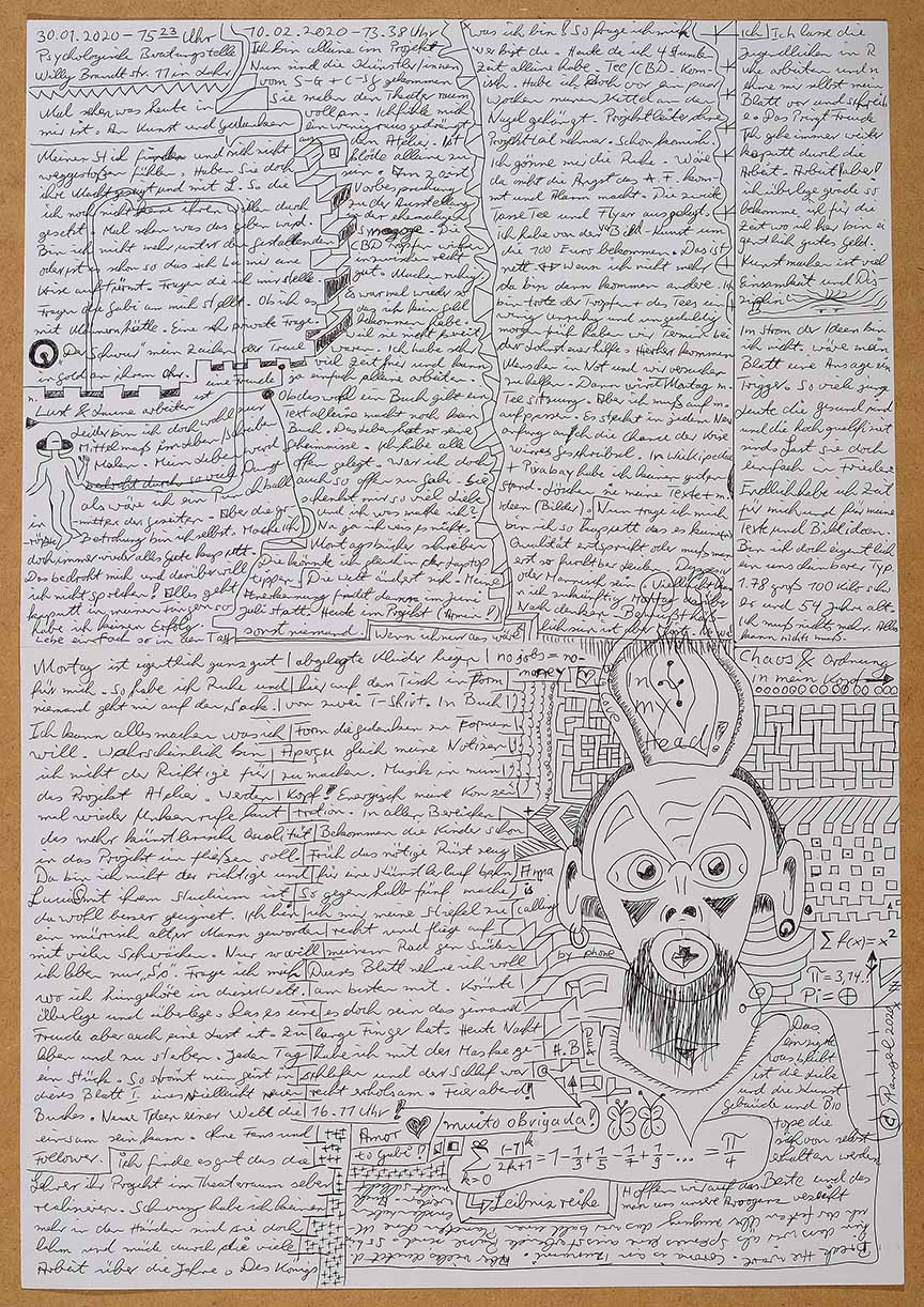 My skill improved through out the years and changed my view on what is nice and ugly. I’m pleased by the work with psychiatric patients and other artists. It stills the hunger of my soul. My pictures, books, lyrics are the mirror of my mind. Beside my cancer and psychotic attacks, it excites me to make my writing and formulas. No therapies can replace my relief of what I’m feeling when I draw or write. It changed during the last 30 years. I take photos of my writings, sketches and words, and collect them in note books and other digital files.