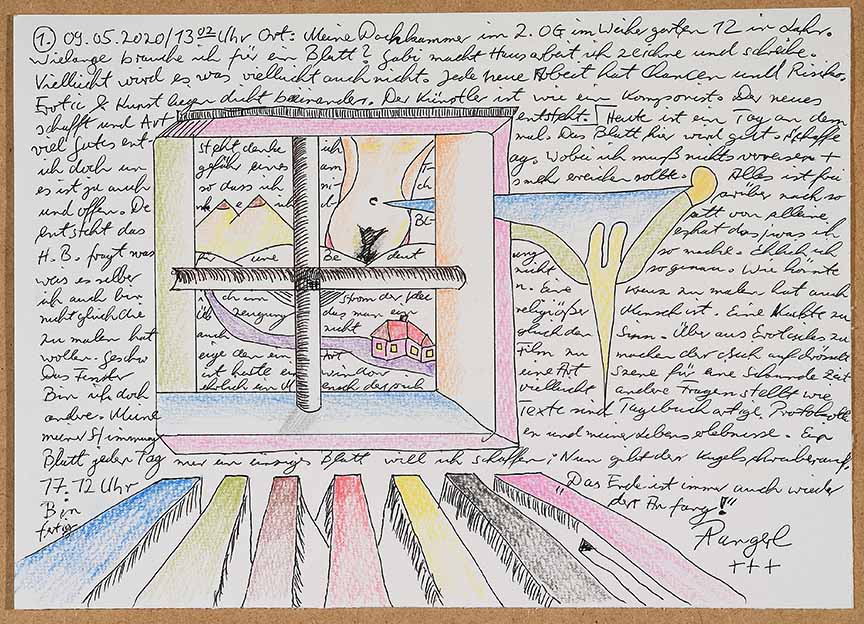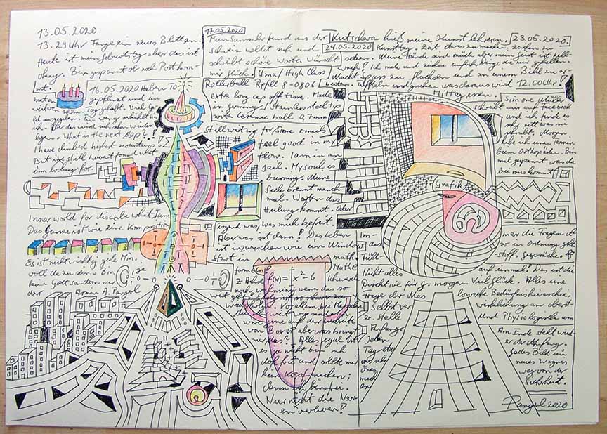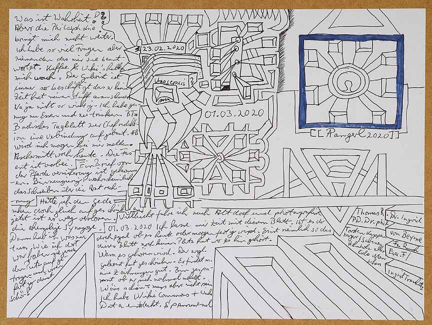 ‘In his line drawings of ornamental character which often include a lot of text, Armin Pangerl deals with messages and memories. Their function as part of his ongoing diary project is more important to him than their quality as single art works. Nevertheless, some of them stand out due to their original compositions.’