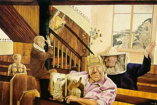 Ian Scott’s otherworldly paintings, frequently bizarre yet always based in a closely focused, detailed reality, attain their strange convictions only because of their visionary quantities. Scott’s rich imagination envisages a world where literally anything can happen. And often does. Yet, as he is quick to point out, many of his unusual scenarios are based on real life: glimpses of street happenings from New York to Wick.