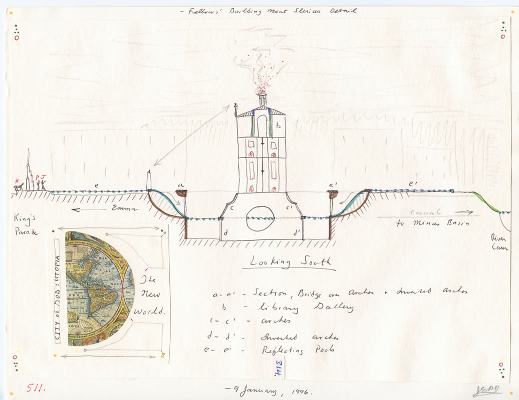 After periods in and out of hospitals, and always longing to return to the idyllic scene of his student days, John decided to create his own utopian city through a series of sketches inspired by his nostalgia for his beloved Cambridge. These drawings, which poetically reimagine the architecture of the College buildings and surrounds, contain hidden codes, symbols and mathematical ratios which imbue the works with a profound and mystical content, deciphered and understood by only the artist himself.