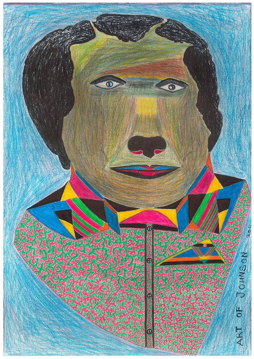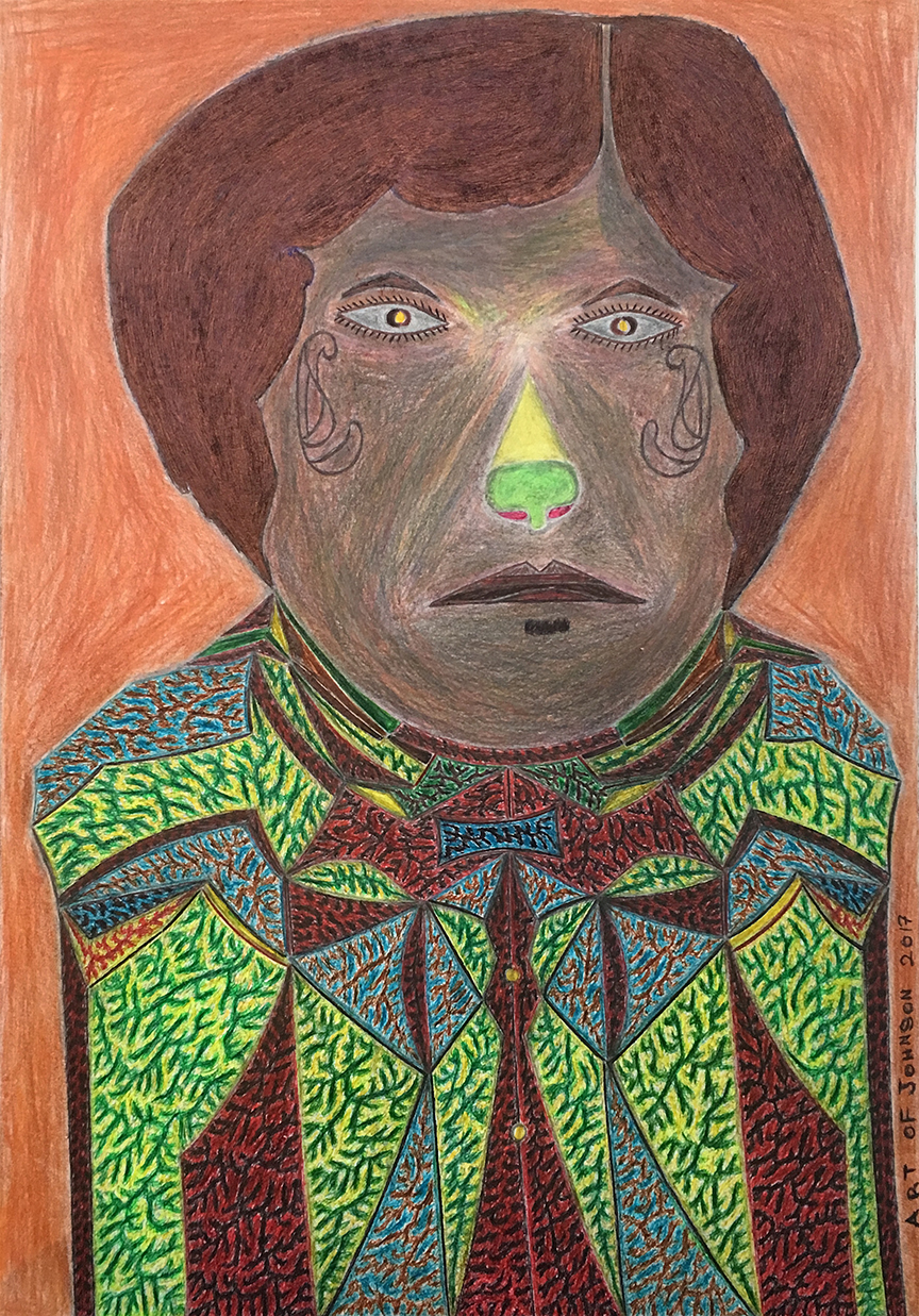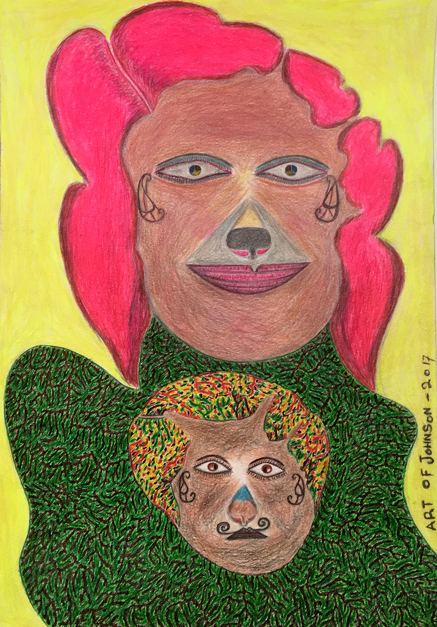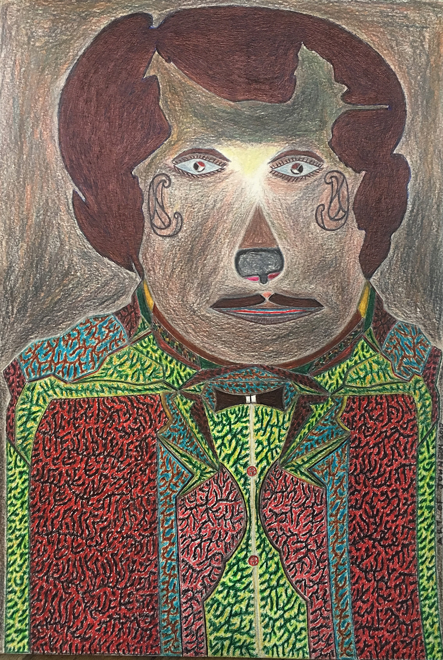 They stare unapologetically from the card. Men’s hairlines recede above doggish noses and pencil-thin lips. Women sport bright blush cheeks and multi-tone mascara. Figures appear within figures, as button-holes, cloud forms or even third eyes.
