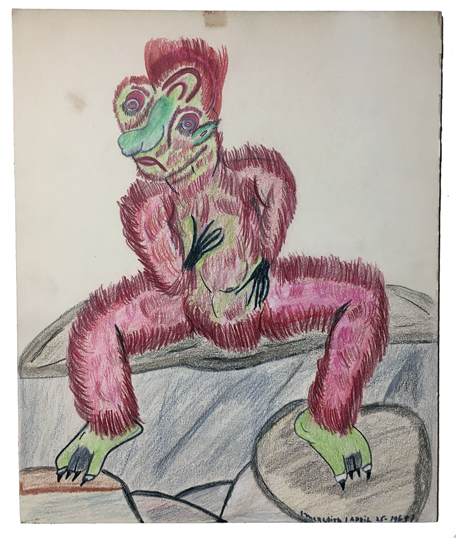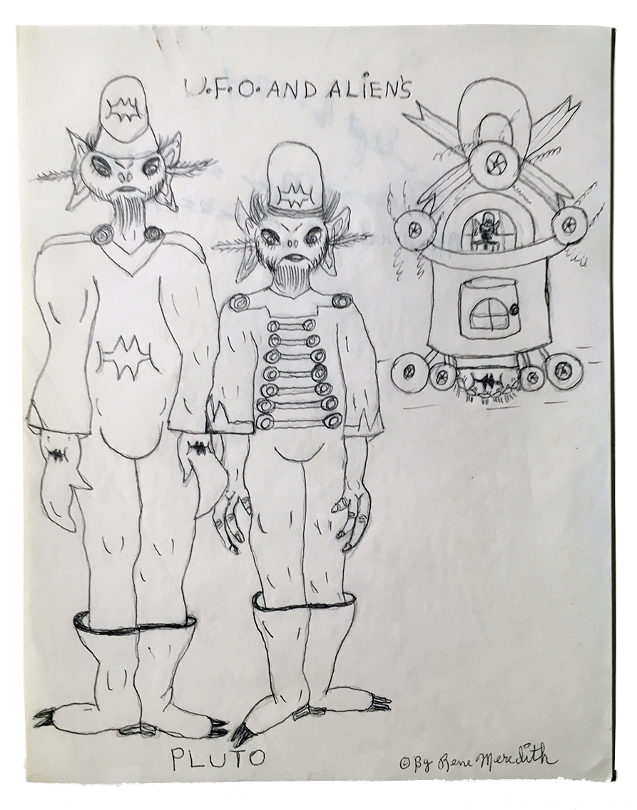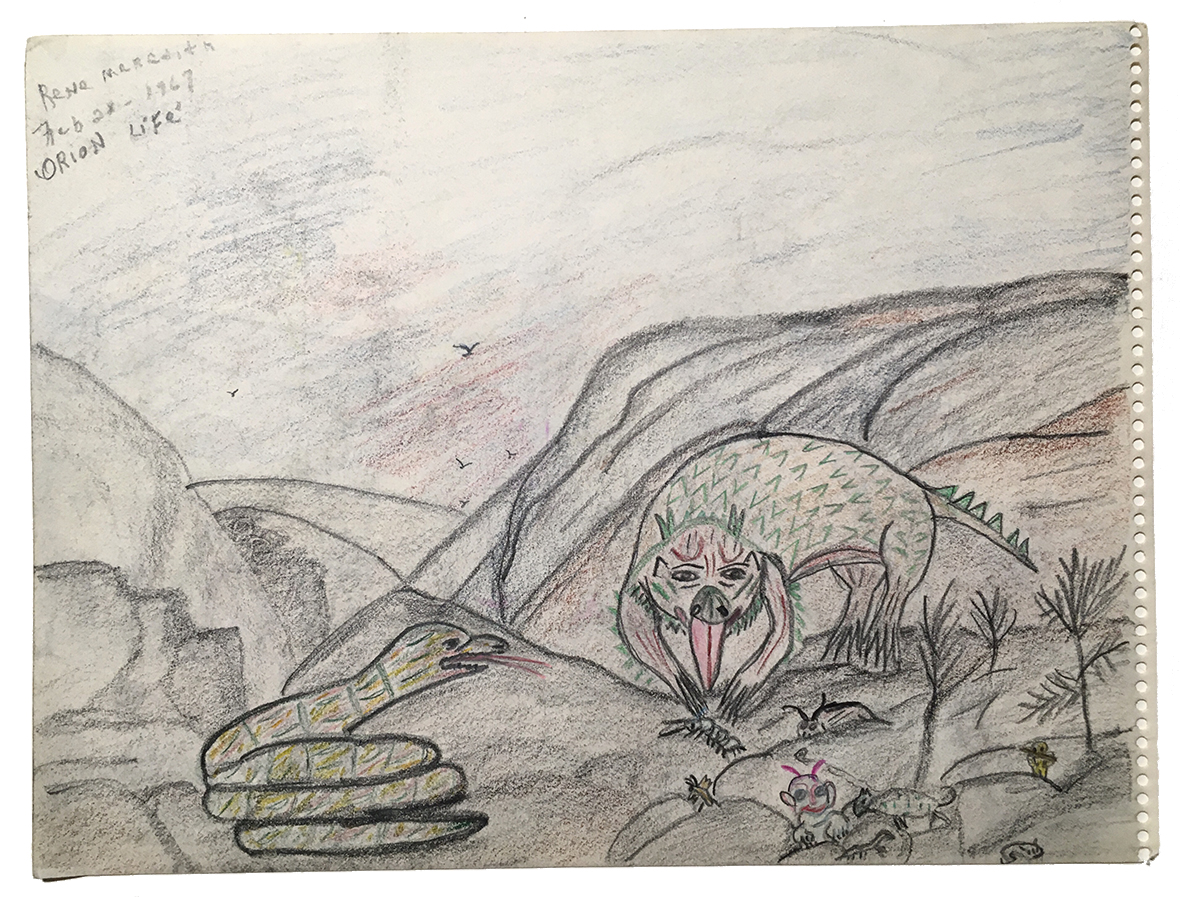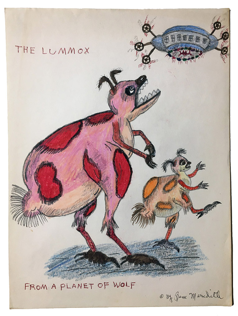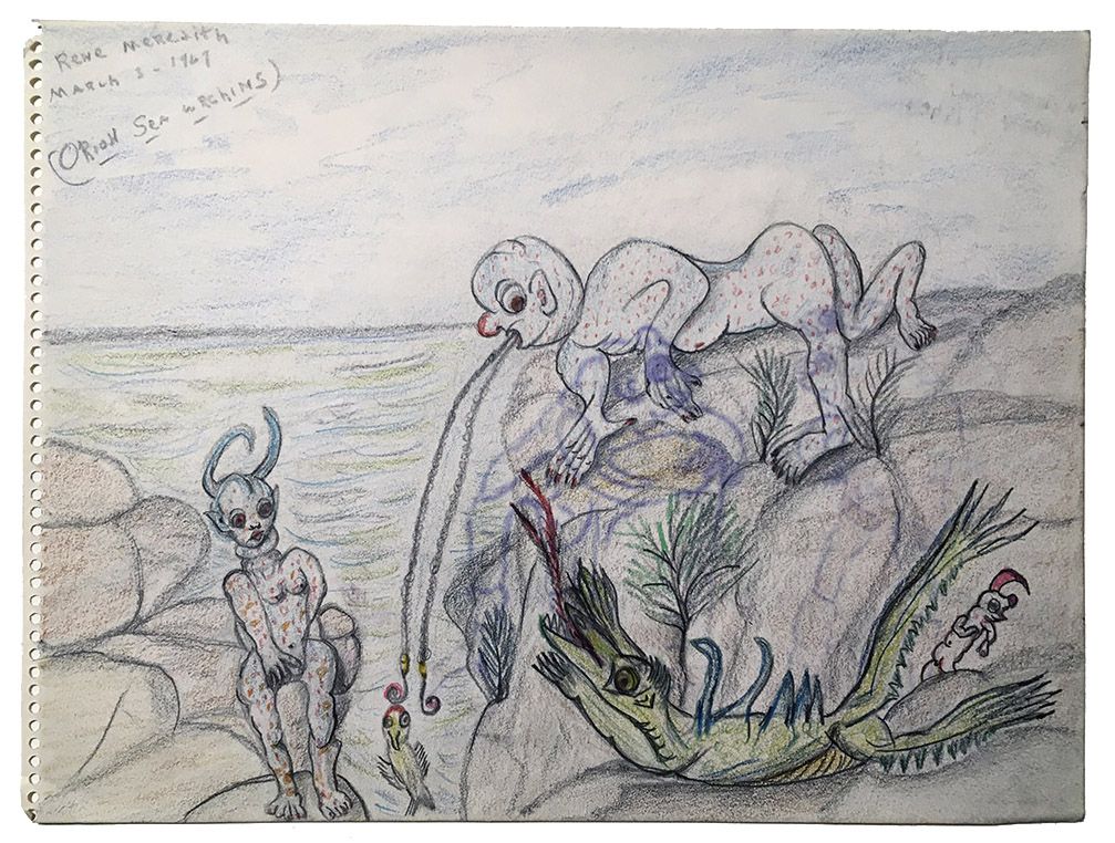 Rene Meredith is a revelation, a previously unknown American self-taught artist, only recently discovered. One hundred and fifty of her remarkable pen and crayon drawings were found in a discarded folder in a Los Angeles flea-market. Nothing at all is known about the woman who created these works, apart from her then location – two addresses in California – the dates the pictures were drawn, and the fact that she thought them important in her life and valued them. It can also be seen that a number of the sketches are stamped ‘SPACE CREATURES, INC’ and also bear a Copyright stamp.