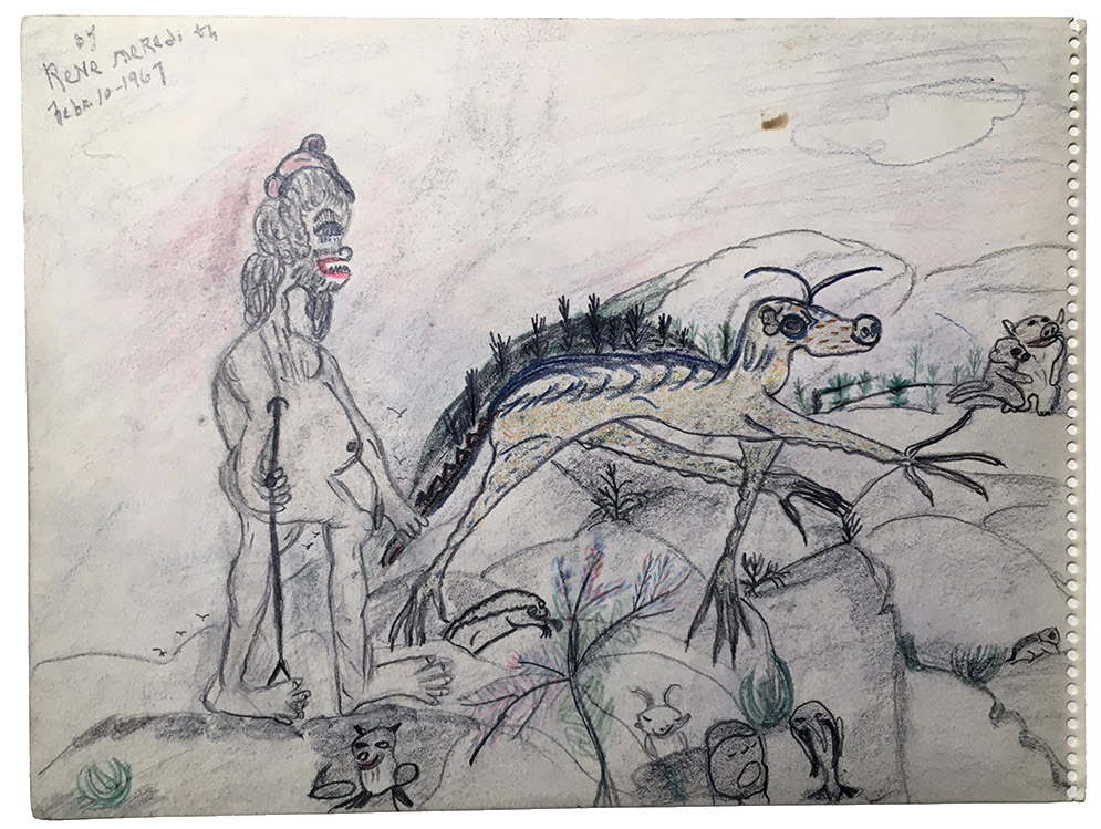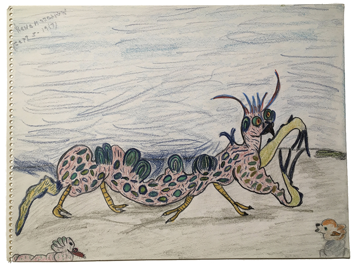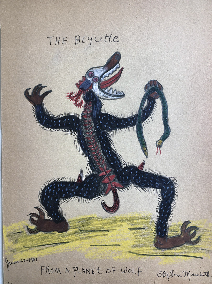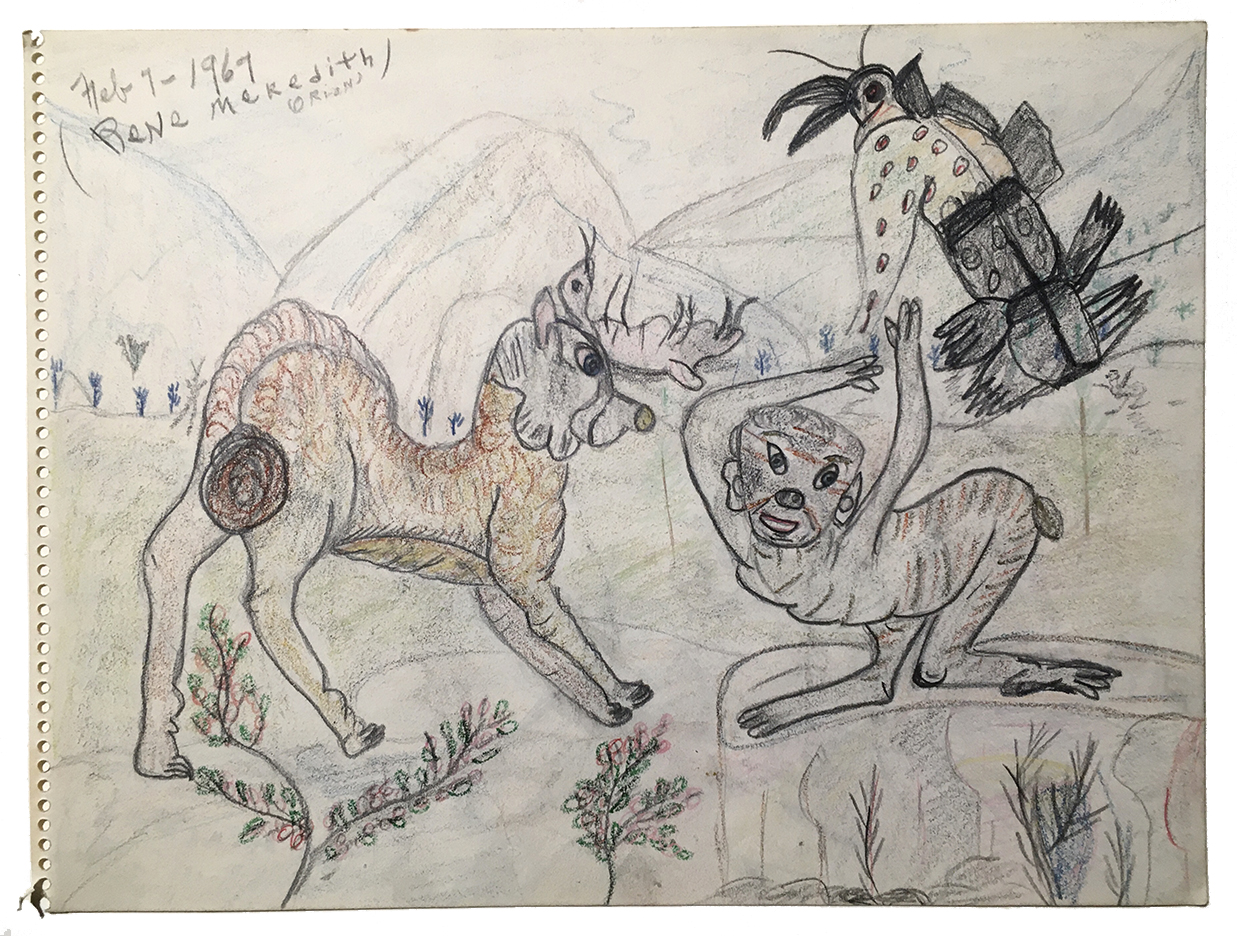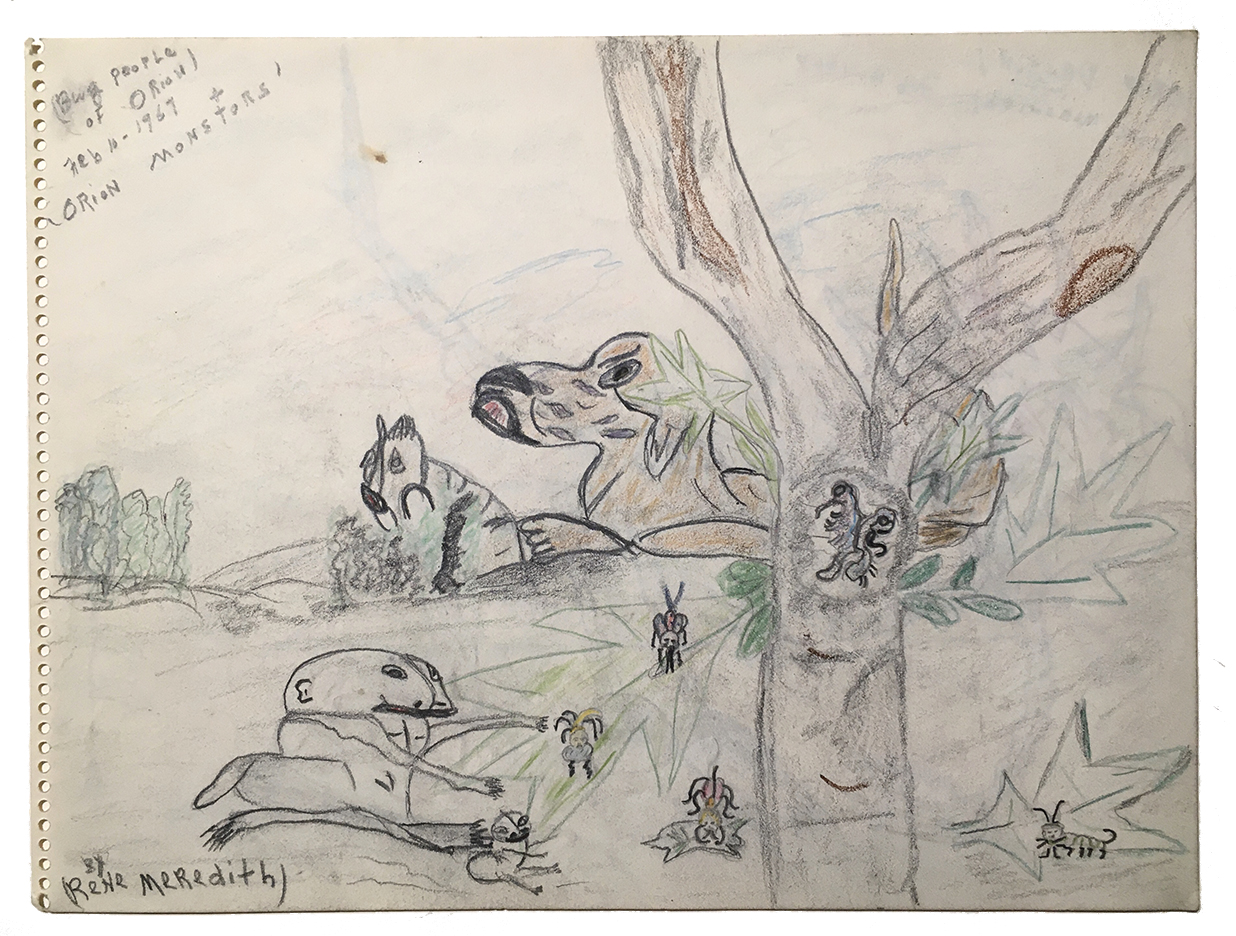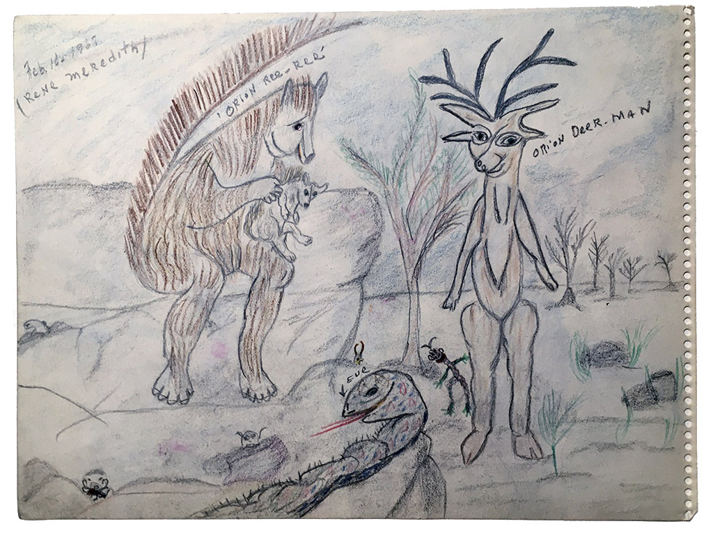 Rene Meredith is a revelation, a previously unknown American self-taught artist, only recently discovered. One hundred and fifty of her remarkable pen and crayon drawings were found in a discarded folder in a Los Angeles flea-market. Nothing at all is known about the woman who created these works, apart from her then location – two addresses in California – the dates the pictures were drawn, and the fact that she thought them important in her life and valued them. It can also be seen that a number of the sketches are stamped ‘SPACE CREATURES, INC’ and also bear a Copyright stamp.