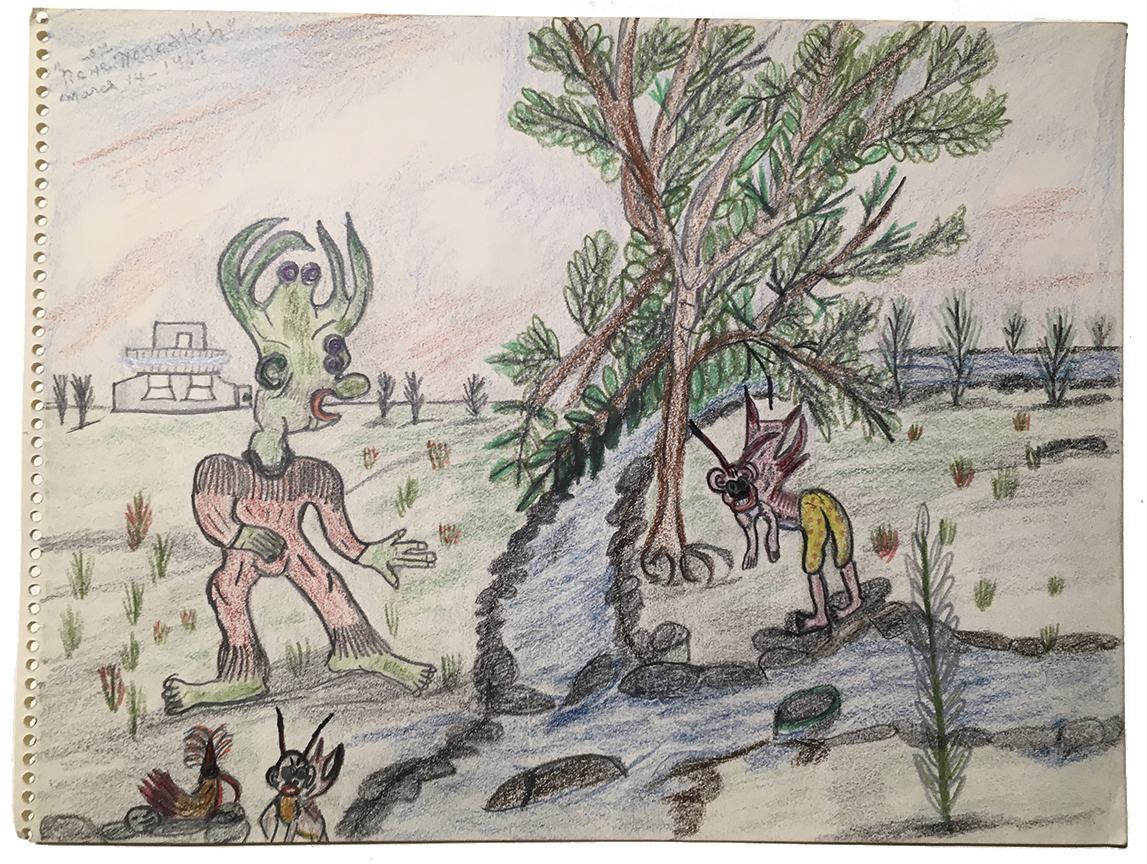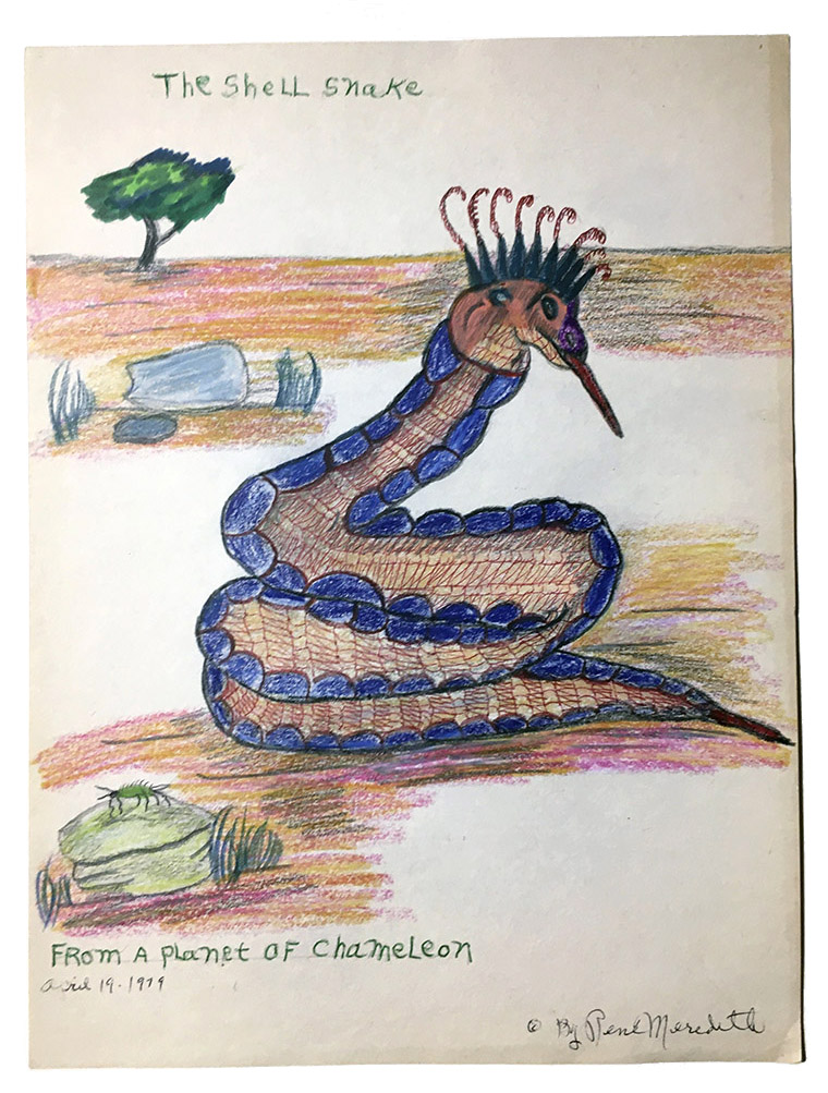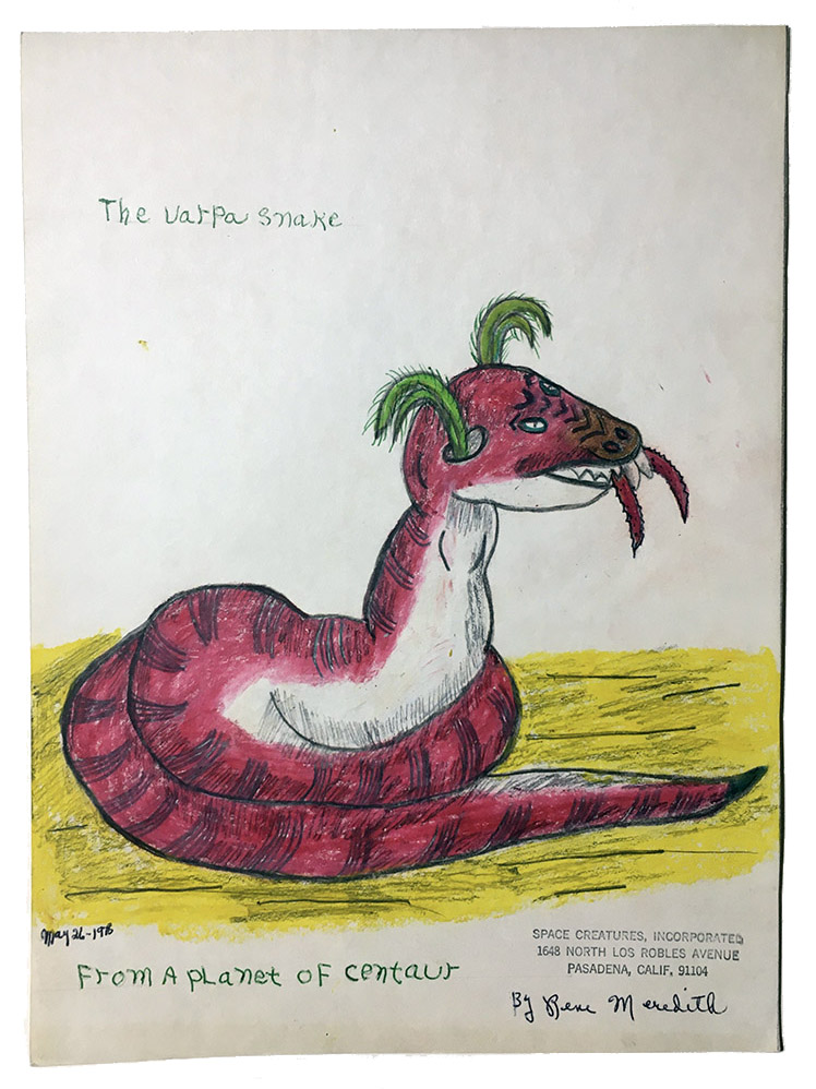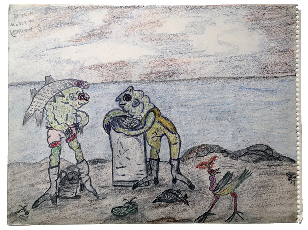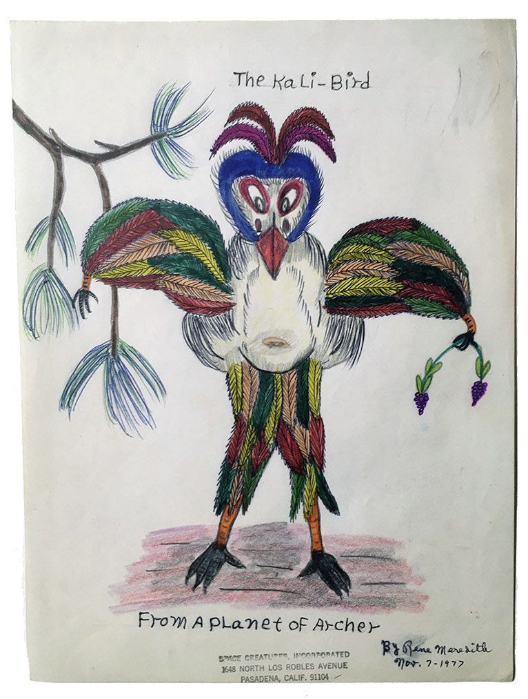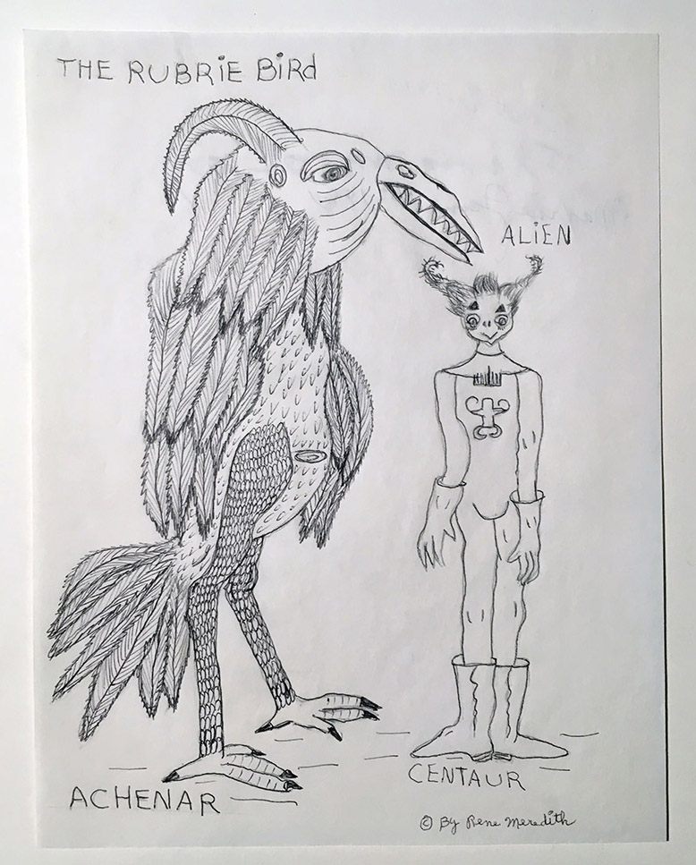 Rene Meredith is a revelation, a previously unknown American self-taught artist, only recently discovered. One hundred and fifty of her remarkable pen and crayon drawings were found in a discarded folder in a Los Angeles flea-market. Nothing at all is known about the woman who created these works, apart from her then location – two addresses in California – the dates the pictures were drawn, and the fact that she thought them important in her life and valued them. It can also be seen that a number of the sketches are stamped ‘SPACE CREATURES, INC’ and also bear a Copyright stamp.