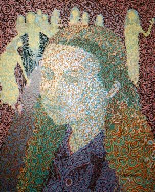 Carson is an outsider Artist who has been subjected at times to sensations of maggots moving in her body since the age of six. One of twins, she was born in London to middle class parents. She describes her childhood as rather unhappy, culminating in a suicide attempt at the age of fifteen. Since then she has spent periods in psychiatric care, enduring chemical and electric therapies without achieving relief from her suffering. The birth of a daughter in her mid-twenties, though, coupled with a move to Cornwall and her marriage, brought psychic stability and for seventeen years a stilling of the feeling of maggots taking over her body. Painting has long been important to Carson, but became Increasingly so when she became ill again in 1996 and started hearing voices. She began spontaneously to paint faces, which she subsequently recognised fellow patients from her earlier stays in psychiatric hospitals, and which brought back a flood of suppressed memories.